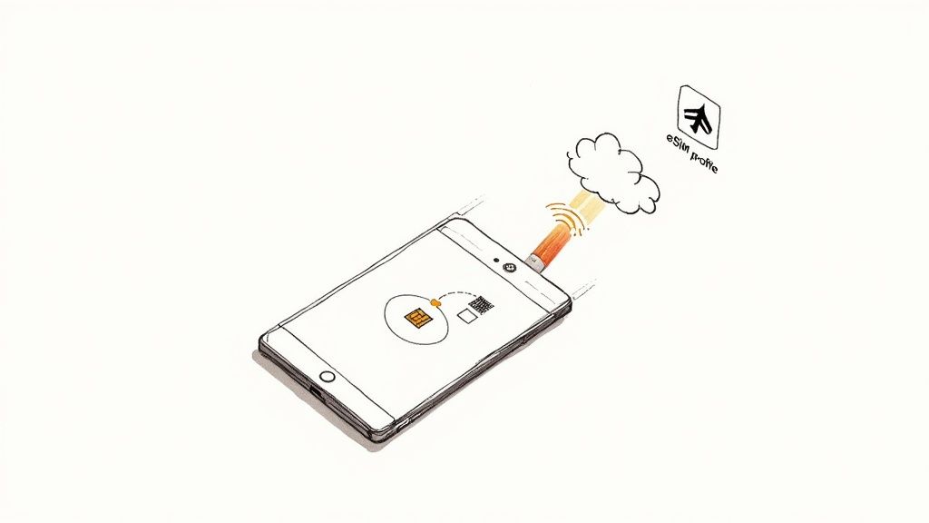 Think of an eSIM as a digital SIM card that's already built right into your phone's hardware. For travelers, this is a game-changer. It lets you download a local data plan from the comfort of your couch before you even start packing. Instead of fiddling with tiny plastic cards, you just install a digital "profile" over Wi-Fi, which connects your phone to a local network the moment you touch down.