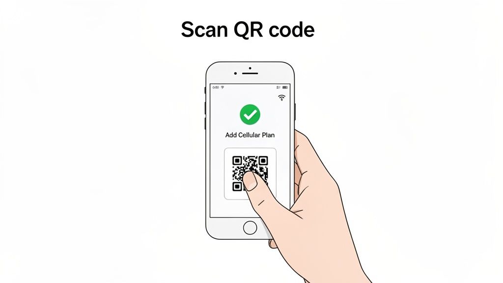 Using a QR code is easily the most common and fastest way to get an eSIM running on your iPhone, especially when you're setting one up for a trip. It’s a simple scan-and-go process that lets you download and activate your new cellular plan in a matter of minutes.